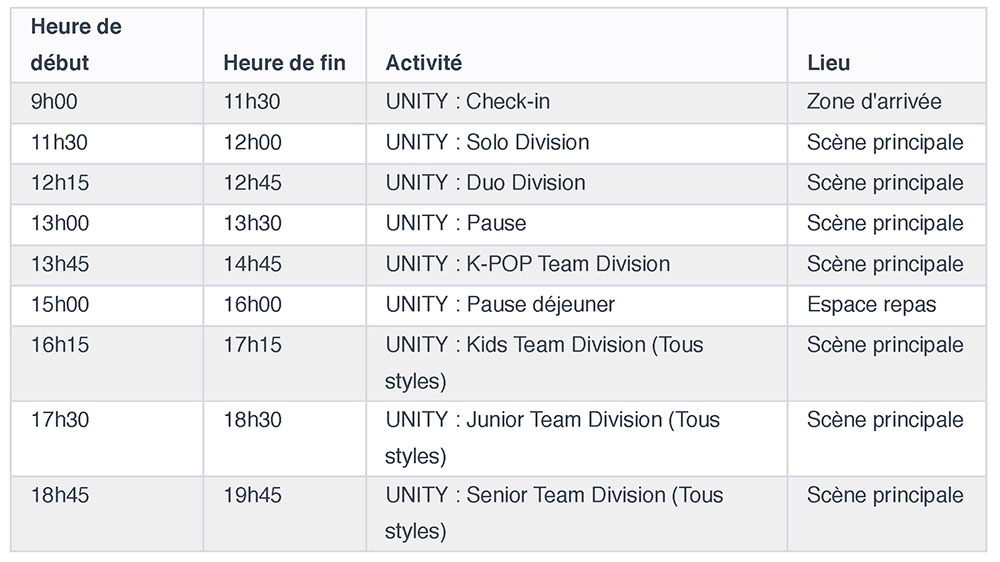 UNITY DANCE LEAGUE: La Ligue de Danse UNITY, fondée en 2023, vise à connecter tous les danseurs tunisiens avec le monde, en reliant les talents locaux avec le public mondial. La compétition de danse UNITY est une opportunité annuelle pour les danseurs de concourir dans un environnement positif et compétitif.