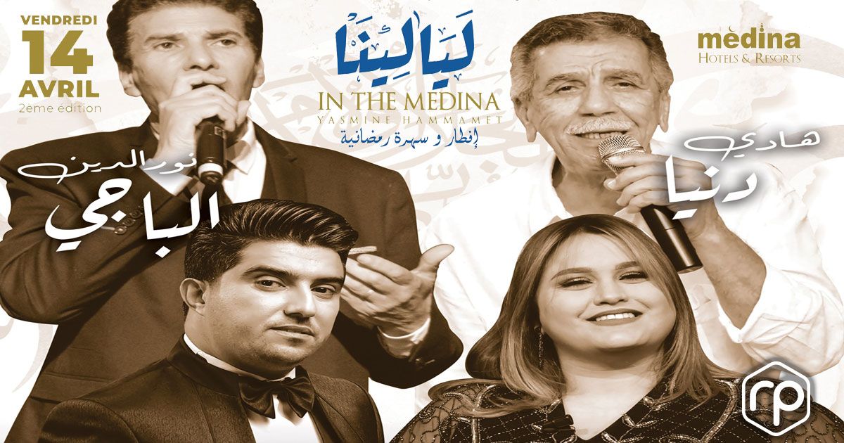 Préparez-vous à une grande soirée de rêve et de festivité remplie de musique et de célébration Spectacle El Hadhra avec les stars Hedi Donia, Sofiene Zaidi , Nourdddine El Beji et Nouha Rhaiem, chaque soirée sera couronnée par une rupture de jeûne avec une variété de vos plats ramadanesques préférés.